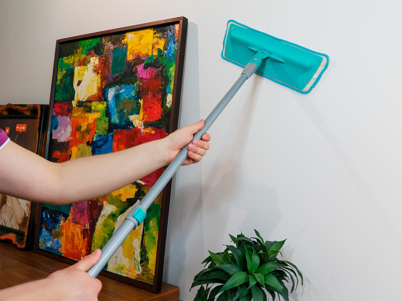 Такая швабра подходит не только для стен, но и для потолков, поэтому ее можно использовать как универсальный инструмент для уборки квартиры.