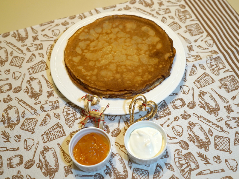 Рецепт блинов с гречневой мукой на молоке со сметаной и апельсиновым джемом