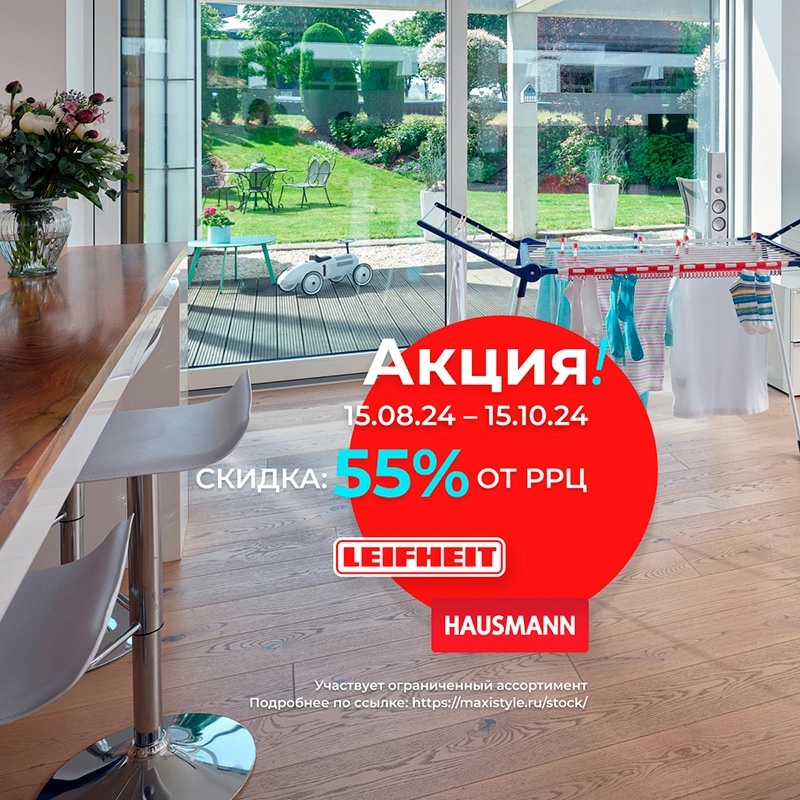 - Скидка 55% от рекомендованной розничной цены на товары для уборки от брендов Hausmann и Leifheit. В эту категорию входят швабры, вёдра, салфетки для уборки и гладильные доски. Эти товары уже давно зарекомендовали себя как надёжные помощники в создании порядка и чистоты в доме.
