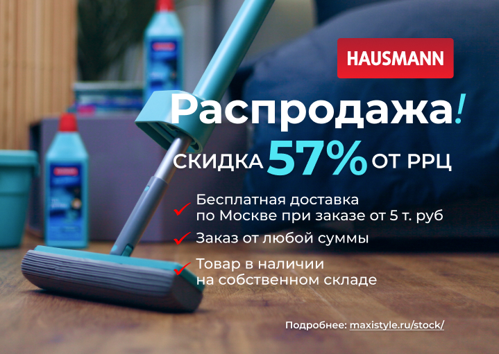 До 22 февраля 2025 года производитель швабр и прочего уборочного инвентаря Hausmann и прямой поставщик “МАКСИ-СТАЙЛ” запускает грандиозную оптовую распродажу! Предложение действует для организаций и индивидуальных предпринимателей, желающих приобрести качественные товары для дома со скидкой 57% от рекомендованной розничной цены (РРЦ).