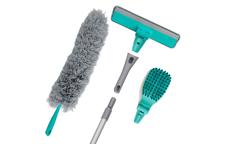 Он включает в себя всё необходимое для генеральной уборки дома: щетку для уборки в труднодоступных местах с абразивной насадкой и щетиной; очиститель - водосгон для стекол и окон, антистатическую щетку для сухой уборки пыли и единый гибкий черенок для всех перечисленных опций.